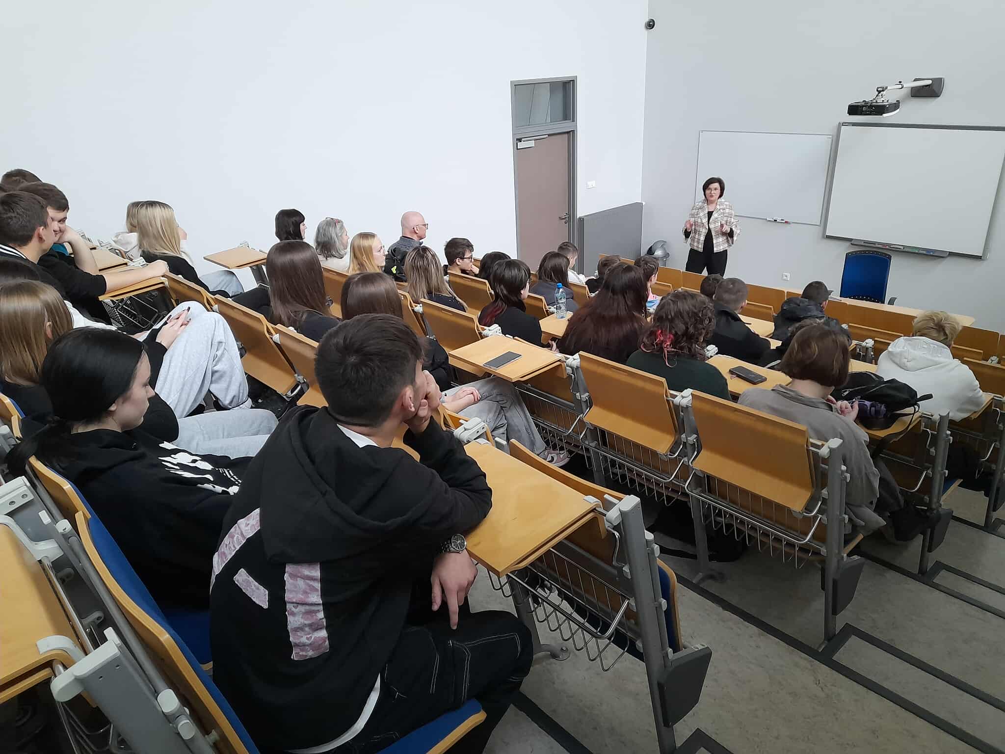 Uczniowie naszej szkoły podczas pierwszych z nowego cyklu spotkań w ramach klas patronackich uczestniczyli w dniu 25 listopada 2025 r. w swego rodzaju spotkaniu autorskim. Połowa składu autorów „Niezbędnika medialnego NGO” w osobach mgra Adriana Jarzębowskiego i dr Magdaleny Zdrowickiej-Wawrzyniak zaprezentowała licealistom poradnik dla liderów organizacji pozarządowych jako niezbędnik dla każdego, kto chce z powodzeniem funkcjonować we współczesnych mediach. Uczniowie nie tylko wysłuchali wystąpienia wykładowców, ale też wzięli udział w ćwiczeniu polegającym na przygotowaniu komunikatów na profile społecznościowe szkoły i stronę internetową. Jedna z grup skorzystała ze wsparcia AI. Drugą część wizyty wypełniło spotkanie z prof. UAM dr hab. Justyną Szczęsną. Pani profesor przeprowadziła warsztaty z zakresu literatury pod tytułem „Różewicza i Wojaczka dotknięcie kresu”.