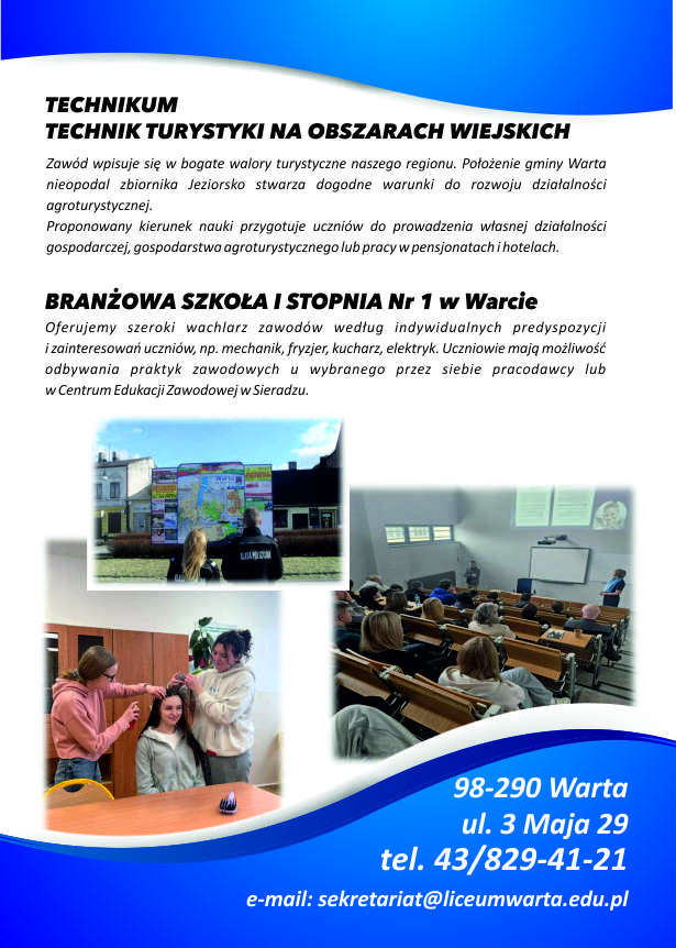 Zawód wpisuje się w bogate walory turystyczne naszego regionu. Położenie gminy Warta nieopodal zbiornika Jeziorsko stwarza dogodne warunki do rozwoju działalności agroturystycznej. Proponowany kierunek nauki przygotuje uczniów do prowadzenia własnej działalności gospodarczej, gospodarstwa agroturystycznego lub pracy w pensjonatach i hotelach.